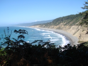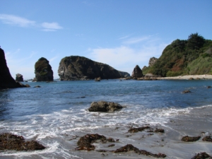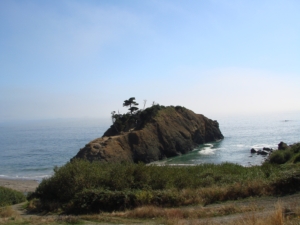 We continued up the coast highway past the town of Brookings and stopped at Harris Beach State Park. It is a lovely park with lots of sites, some small for older style camping and a few large ones for the big rigs. We picked a site next to the trail that led right out our camp site and down a long a winding path through the woods to the beach. The beach here is beautiful, some large rocks that add interest and the opportunity to climb around and also enjoy the sand and surf. Mattie loved the beaches, she ran at the edge of the water and burned 360’s in the sand. We spent a lot of time just sitting on the drift wood and enjoying the view.
