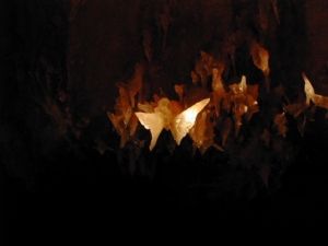 One of my tennis buddies recommended a side trip to the Sonoran Caverns, a crystal cave, outside Sonora, Texas. The signs on the highway are sort of run down and in need of paint and the location is about 15 miles off the highway but well worth the trip. We were ortunate to have a guide that had been caving for about 40 years and he was very knowledgeable and excited to be showing us the caverns. This is a living cave with dripping water and beautiful crystal formations. The narrow paths wind tightly through the caverns. There is lighting to highlight some of special features. I loved this butterfly formation.